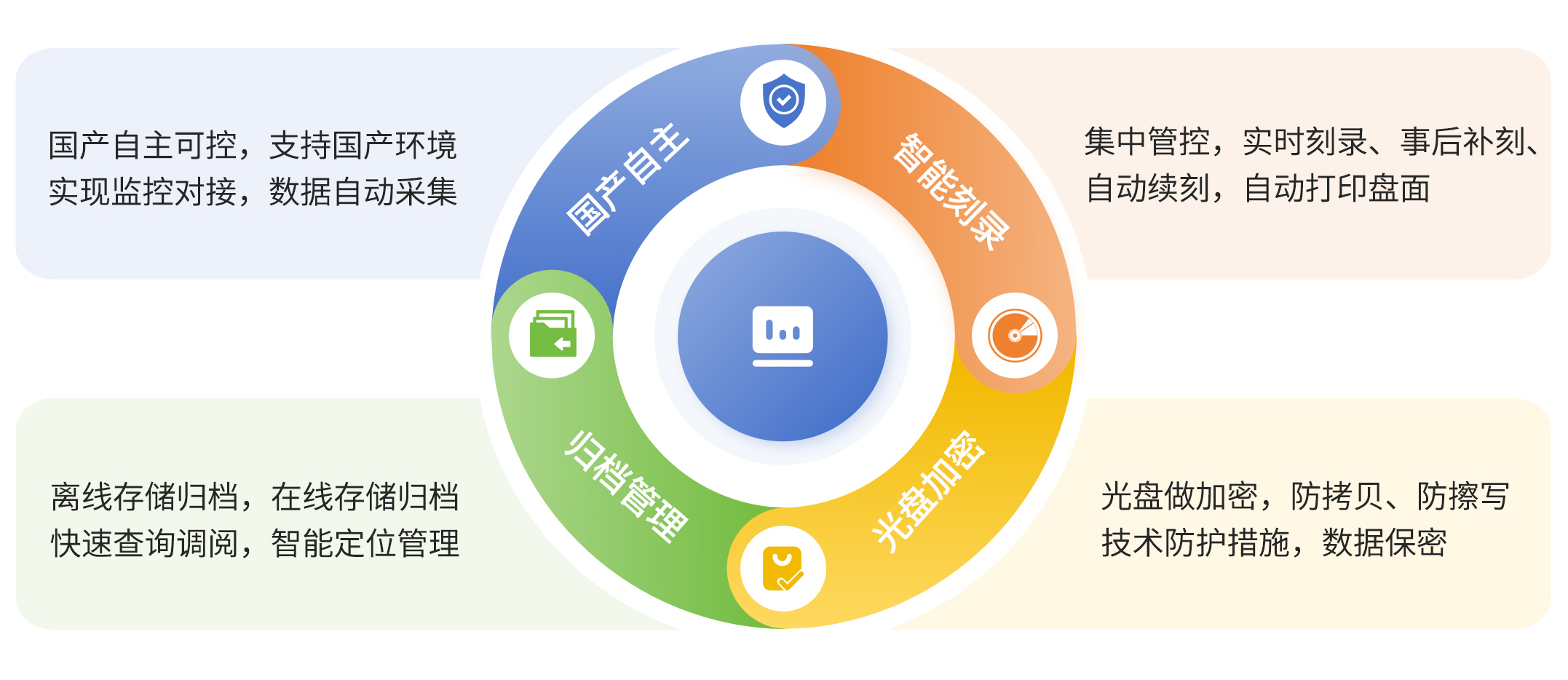 安裝部署留置談話音視頻數(shù)據(jù)刻錄歸檔管理平臺,配套自主研發(fā)的同步錄音錄像光盤打印刻錄一體機,搭配智能離線光盤歸檔管理柜、虛擬光盤存儲庫、專業(yè)級光盤,實現(xiàn)一站式異質(zhì)雙備份歸檔刻錄管理方案,運行安全穩(wěn)定且支持國產(chǎn)化環(huán)境實現(xiàn)監(jiān)控對接,減少人為操作,滿足歸檔的及時性、規(guī)范性、安全性,大幅提升工作效率。