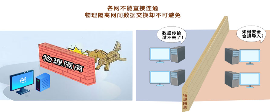 在當(dāng)今信息化、數(shù)字化時代,各種數(shù)據(jù)傳輸和儲存技術(shù)發(fā)展迅速,各安全領(lǐng)域行業(yè)對跨網(wǎng)數(shù)據(jù)交互需求日益迫切,數(shù)據(jù)傳輸?shù)陌踩煽啃詫τ谡麄€過程的重要性不可忽視。應(yīng)如何解決網(wǎng)絡(luò)安全與效率之間的矛盾,如何安全合規(guī)地實現(xiàn)跨網(wǎng)數(shù)據(jù)單向?qū)?導(dǎo)出、數(shù)據(jù)交換應(yīng)用。依據(jù)《計算機信息系統(tǒng)國際互聯(lián)網(wǎng)保密管理規(guī)定》的要求 :“涉及國家秘密的計算機信息系統(tǒng),不得直接或間接地與國際互聯(lián)網(wǎng)或其它公共信息網(wǎng)絡(luò)相聯(lián)接,必須實行物理隔離?!?